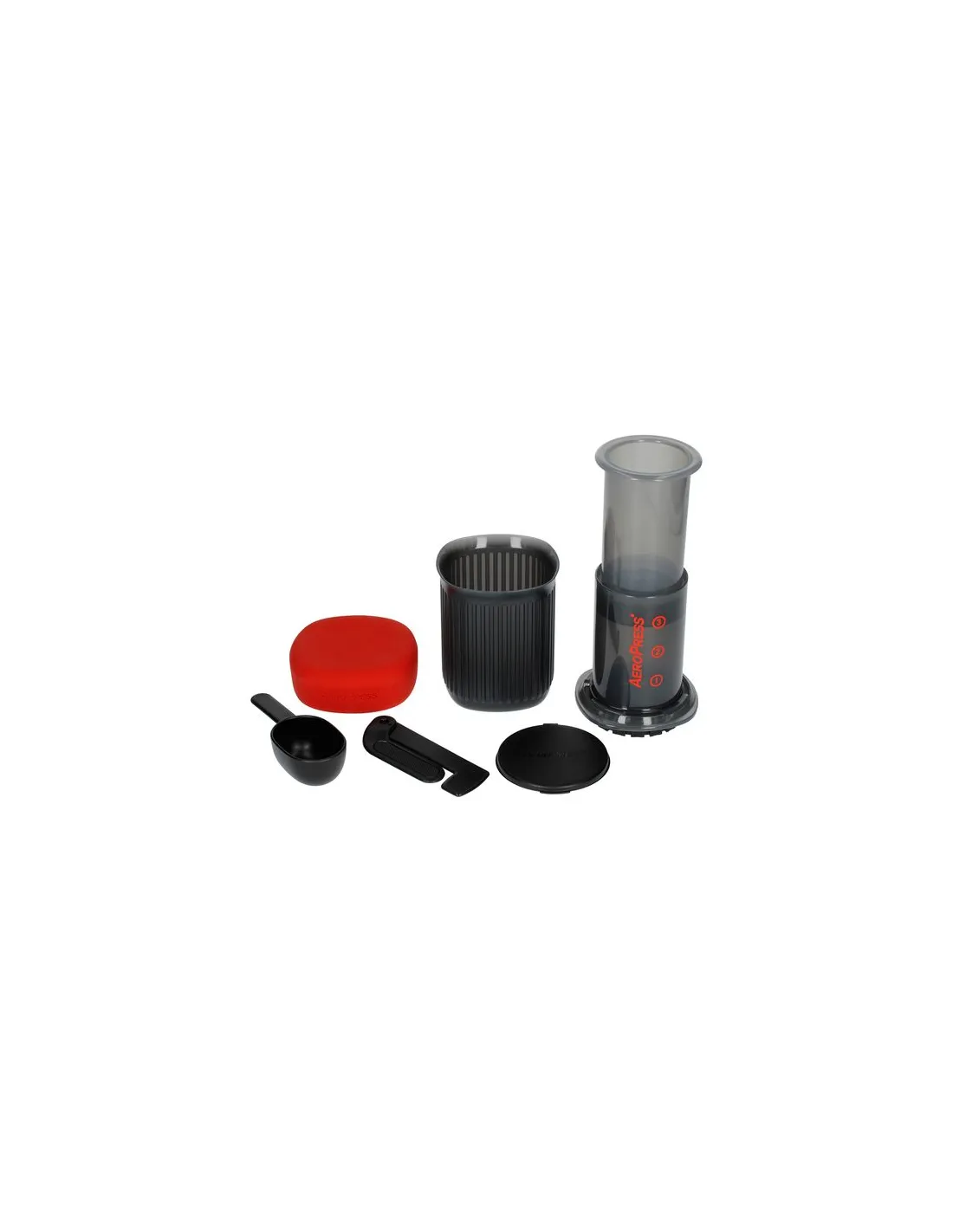 Zestaw zawiera: Aeropress, 50 papierowych filtrów, mieszadełko, miarkę, uchwyt na filtry (na 20 filtrów), kubek i pokrywkę.