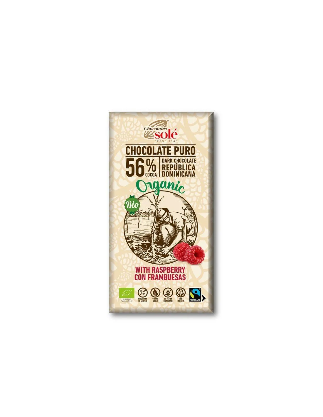 Czekolada Solé - 56% organiczna czekolada z malinami. Świeże połączenie pysznych smaków kakao i malin.