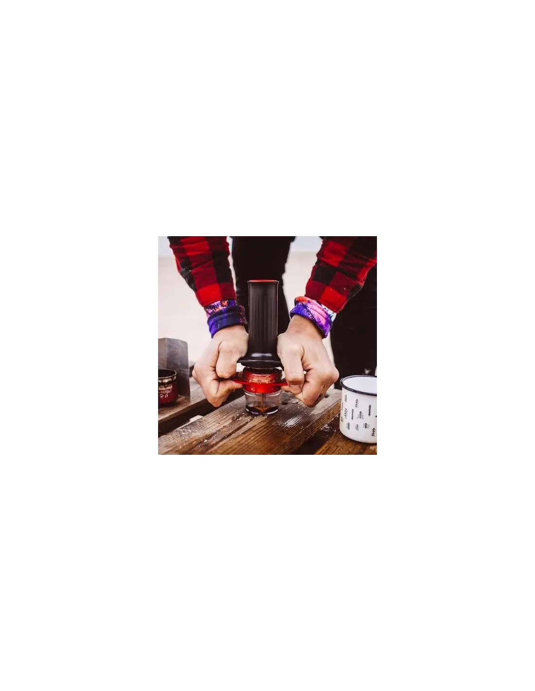 Uporaba: V košarico za kavo vlijte 10-15 gramov fino mlete kave in jo zatlačite z merilno skodelico. Postavite skodelico v pregibe košaric. Prozorno komoro z vstavljenim filtrom in tesnilom na dnu privijte na košarico.V komoro vlijte 30-60 ml vode (ne sme biti več), po možnosti s temperaturo 94 stopinj. Črni bat rahlo potisnite navznoter (tako, da sta jezička na batu in košarici v istem položaju). Počakajte približno eno sekundo. Nato z rokami pritisnite ročaje skupaj, dokler ne dobite okusnega napitka.