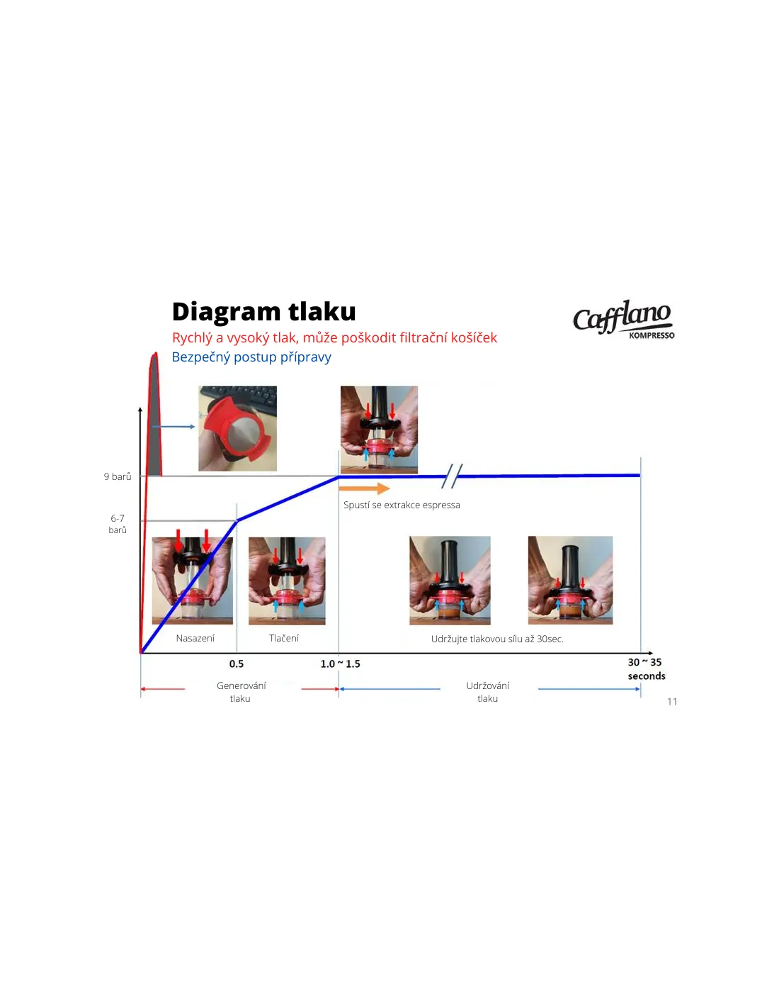 Cafflano Kompresso je odličen in enostaven za uporabo pripomoček za pripravo gostega, kremastega espressa pri tlaku 9 barov . Ta tlak med celotno ekstrakcijo vzdržuje hidravlični sistem v skladu s Pascalovim načelom (tlak, ki ga zunanja sila deluje na tekočino v zaprti posodi, je v vseh točkah tekočine enak).