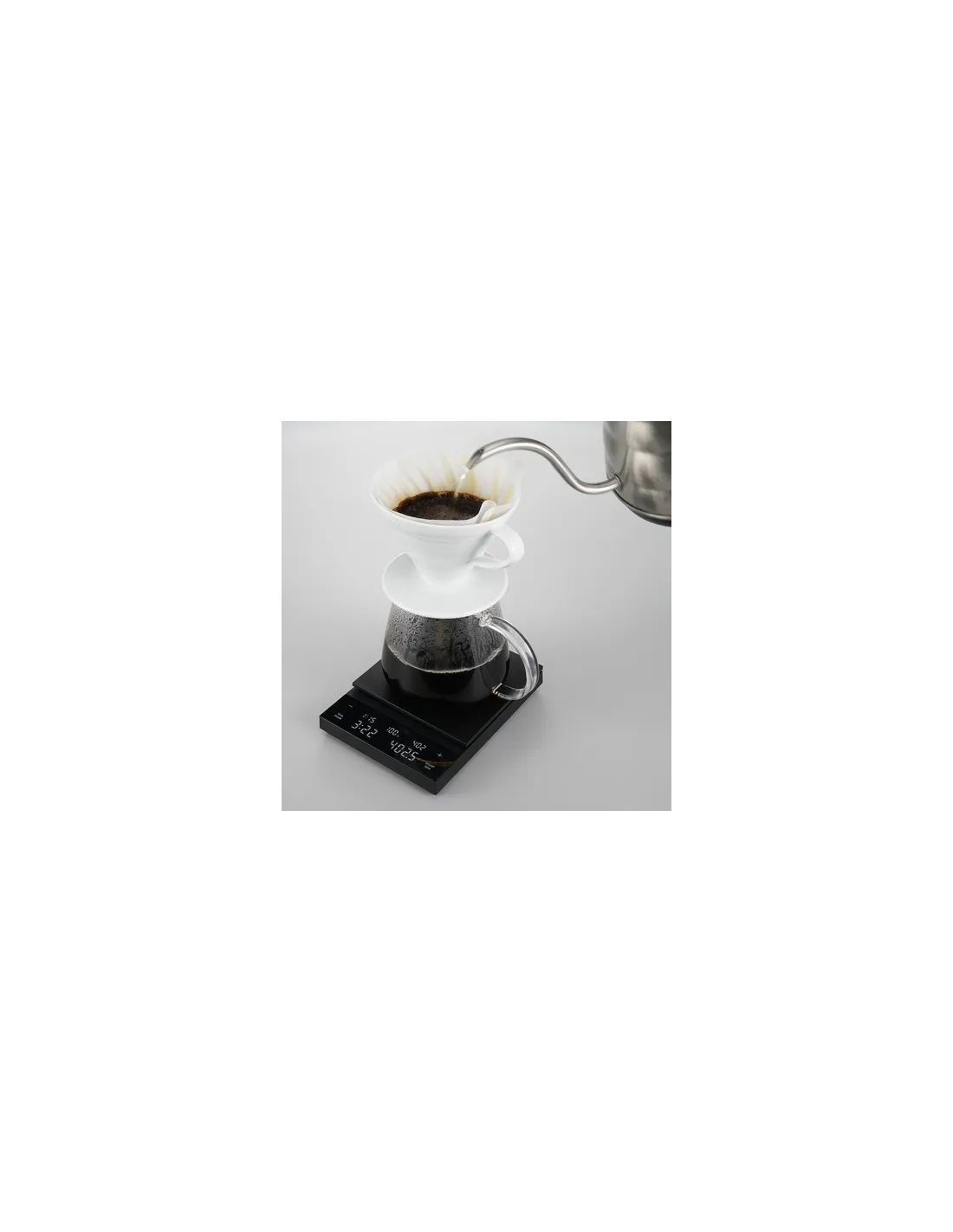 Tehtnica navdušuje s svojo minimalistično in elegantno zasnovo z visokokakovostnimi materiali in natančno izdelavo vsake podrobnosti. Ohišje je izdelano iz gladke, matirane plastike, ki prispeva k splošnemu vtisu čistoče in sodobnega videza. Zaradi kompaktnih dimenzij tehtnica zlahka sprejme dodatke, kot so Chemex, dripper ali AeroPress.