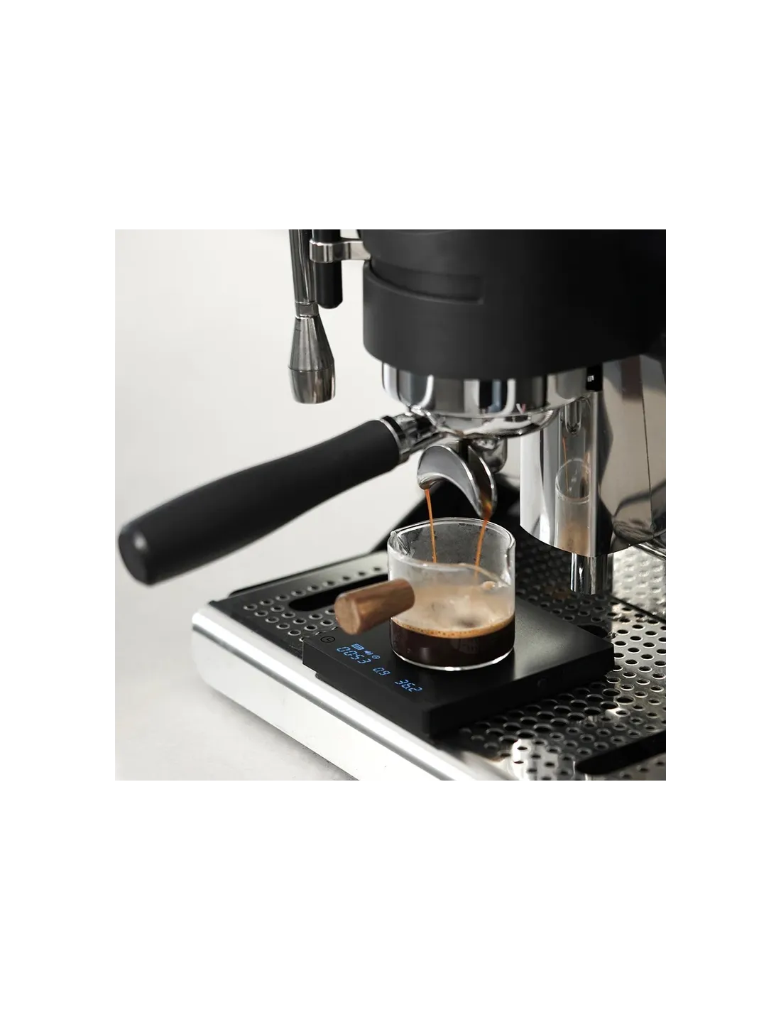 Minimalističen, eleganten in sodoben videz tehtniceTimemore Mini Espresso z visokokakovostnimi materiali in pozornostjo do vsake podrobnosti. Ohišje je izdelano iz gladke, mat črne plastike - podatki so nevidni, dokler se ne dotaknete plošče in se prižgejo. Tehtnica se upravlja z dvema gumboma na plošči na dotik. Vrh tehtnice je vodoodporen. Prav tako tudi vhod USB-C za polnjenje, zahvaljujoč silikonskemu vodoodpornemu pokrovčku.