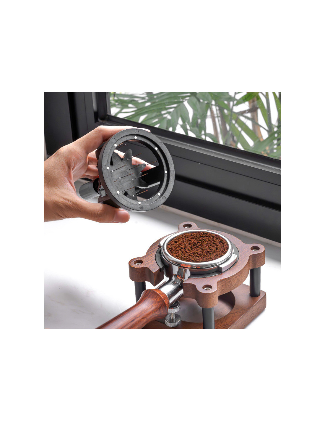 Profesionalni razdelilnik kave Kaffia WDT Premium V2 (58 mm) za popolno porazdelitev mlete kave v vzvodu. Izdelan je iz trpežne kovine in zagotavlja natančno pripravo espressa z enakomerno ekstrakcijo in stabilnim okusom.