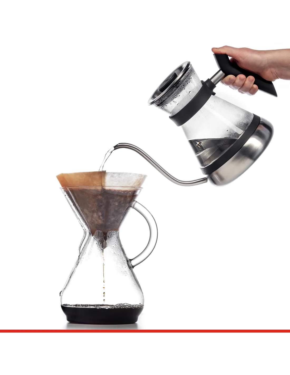 Edinstveni stekleni čajnik z ozkim izlivom, primeren za filter kavo. Deluje na indukcijskem ogrevanju. Prostornina: 1,2 l.