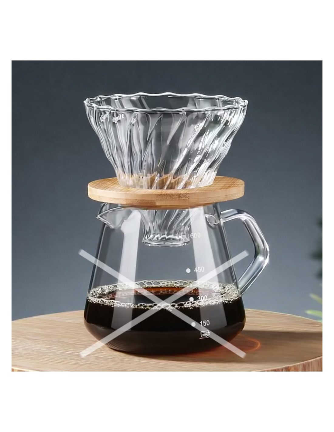 Eleganten steklen kapljalnik z lesenim podstavkom za filter kavo. Združuje funkcionalnost, čist dizajn in naravne materiale.