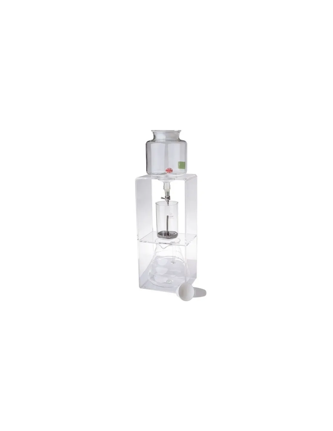 V zgornji posodi je hladna voda, ki počasi kaplja skozi filter iz nerjavečega jekla v spodnjo posodo za serviranje. S kovinskim ventilom je mogoče enostavno prilagoditi hitrost pretakanja vode. Filtriranje lahko traja več ur, odvisno od nastavitve ventila in vašega okusa. Idealna nastavitev je hitrost pretoka 1 kapljica na sekundo. Polna posoda je tako filtrirana v približno 5 urah. Eksperimentirate lahko tudi z grobostjo izbrane kave.