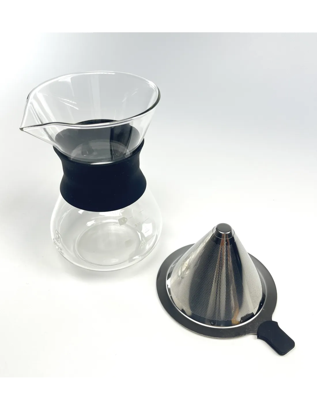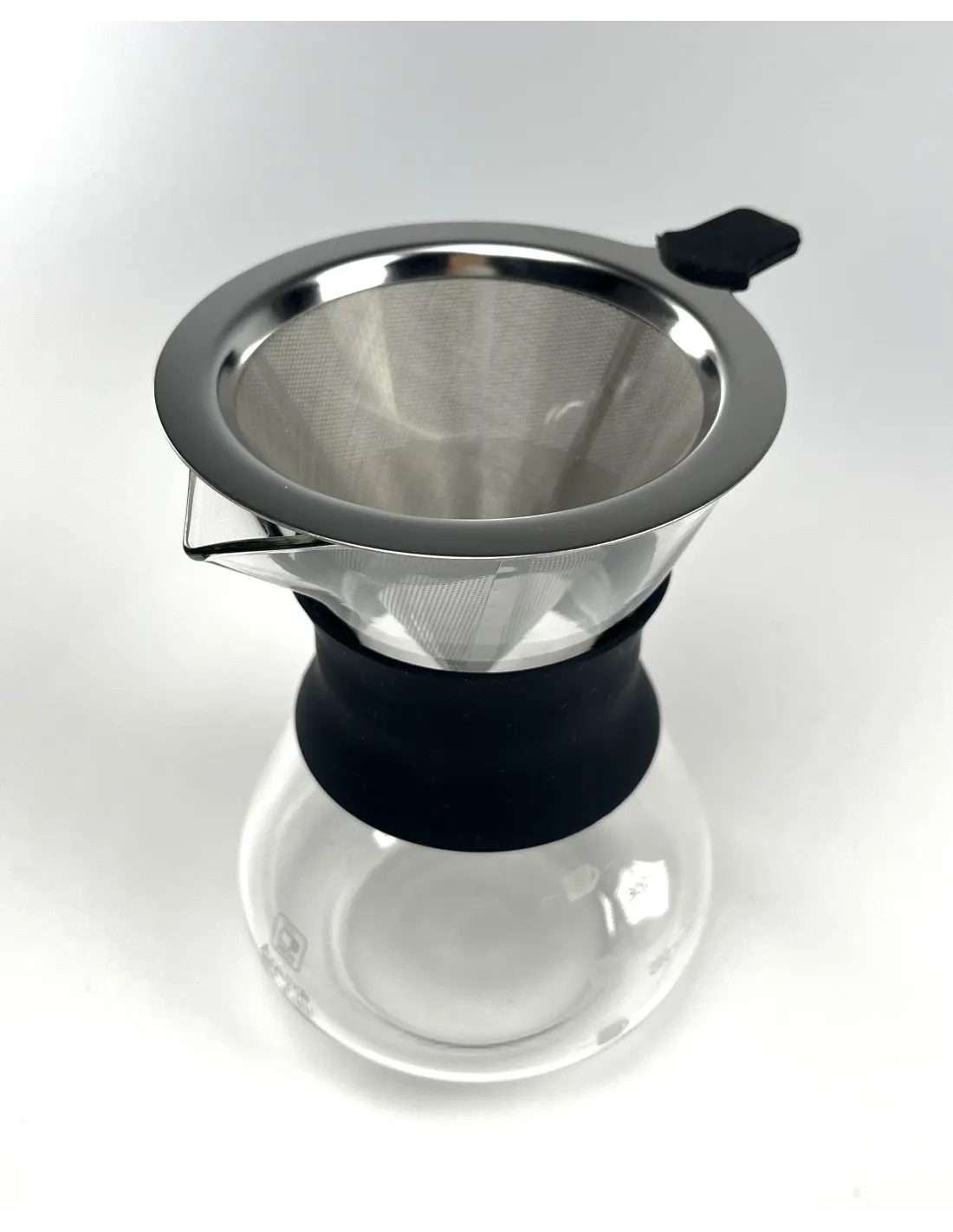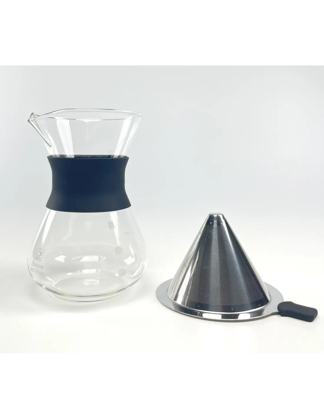 Dekanter Kaffia Kone ima fin kovinski filter, iz katerega se ekstrahirana kava preliva neposredno v vrč, iz katerega jo lahko neposredno postrežete. To je tudi zanimiva alternativa za tiste, ki ne marajo papirnatih filtrov v dripperju, ki bo hkrati veliko bolj ekonomična in okolju prijazna rešitev. Kovinski filter prepušča tudi več finih kavnih olj kot drugi filtri, kar daje kavi bolj čvrsto strukturo.