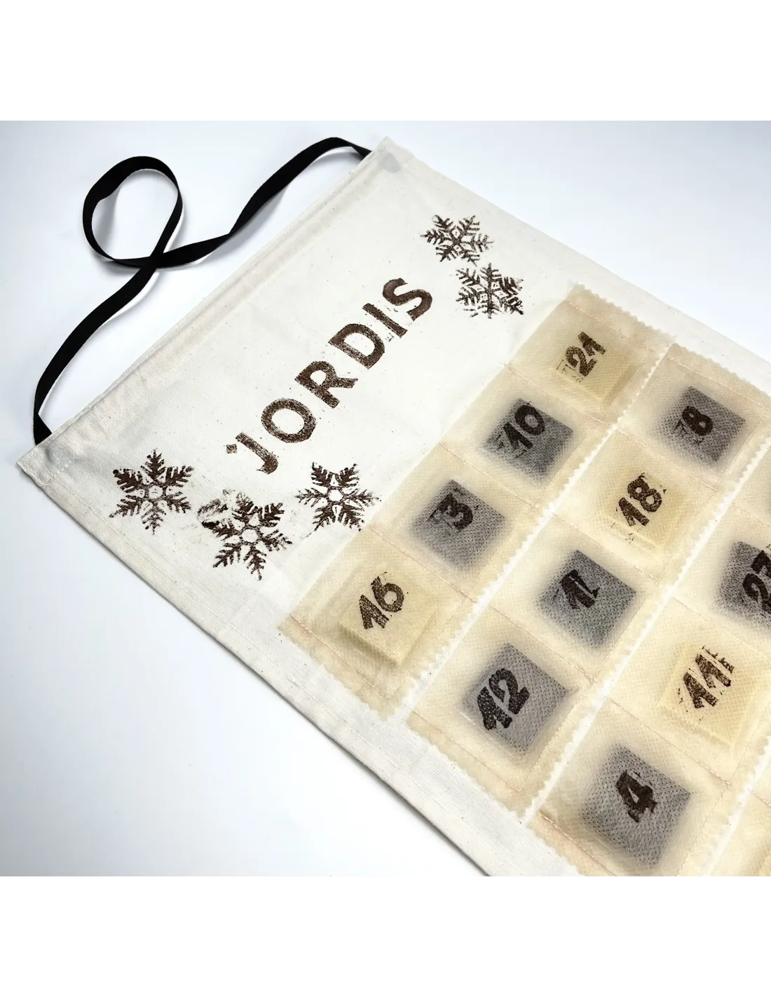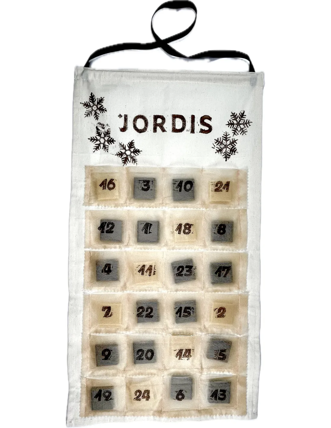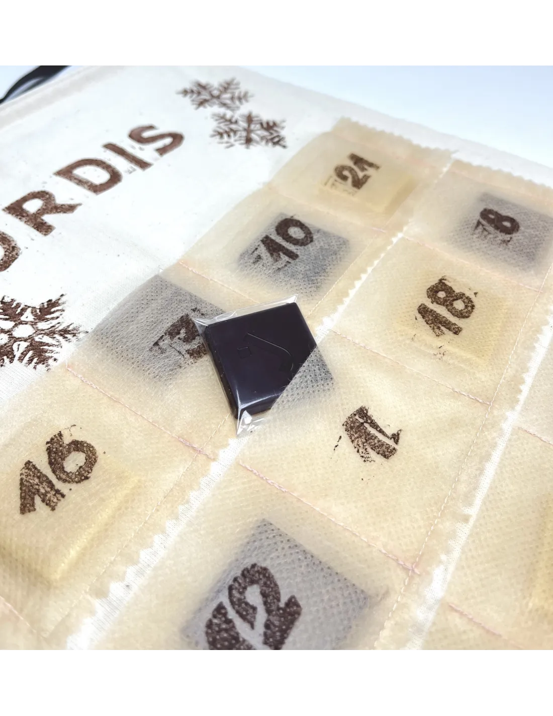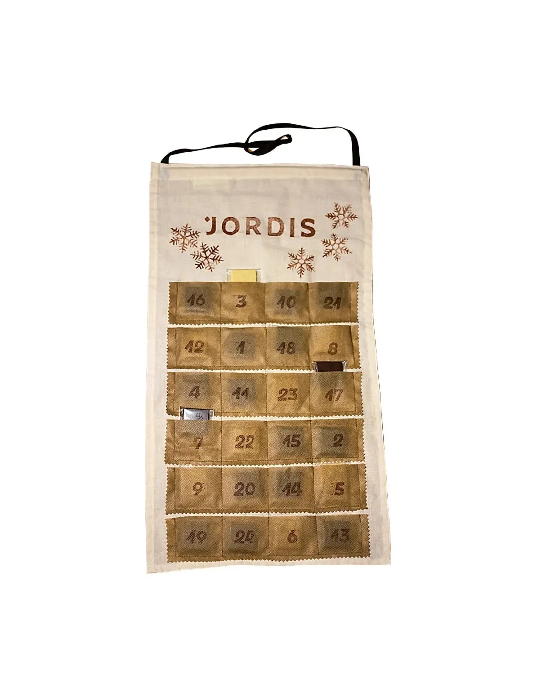 Adventni koledar iz Jordisa vsebuje 24 napolitank (4 g mlečne, temne, bele čokolade) pakiranih v celofansko vrečko.
