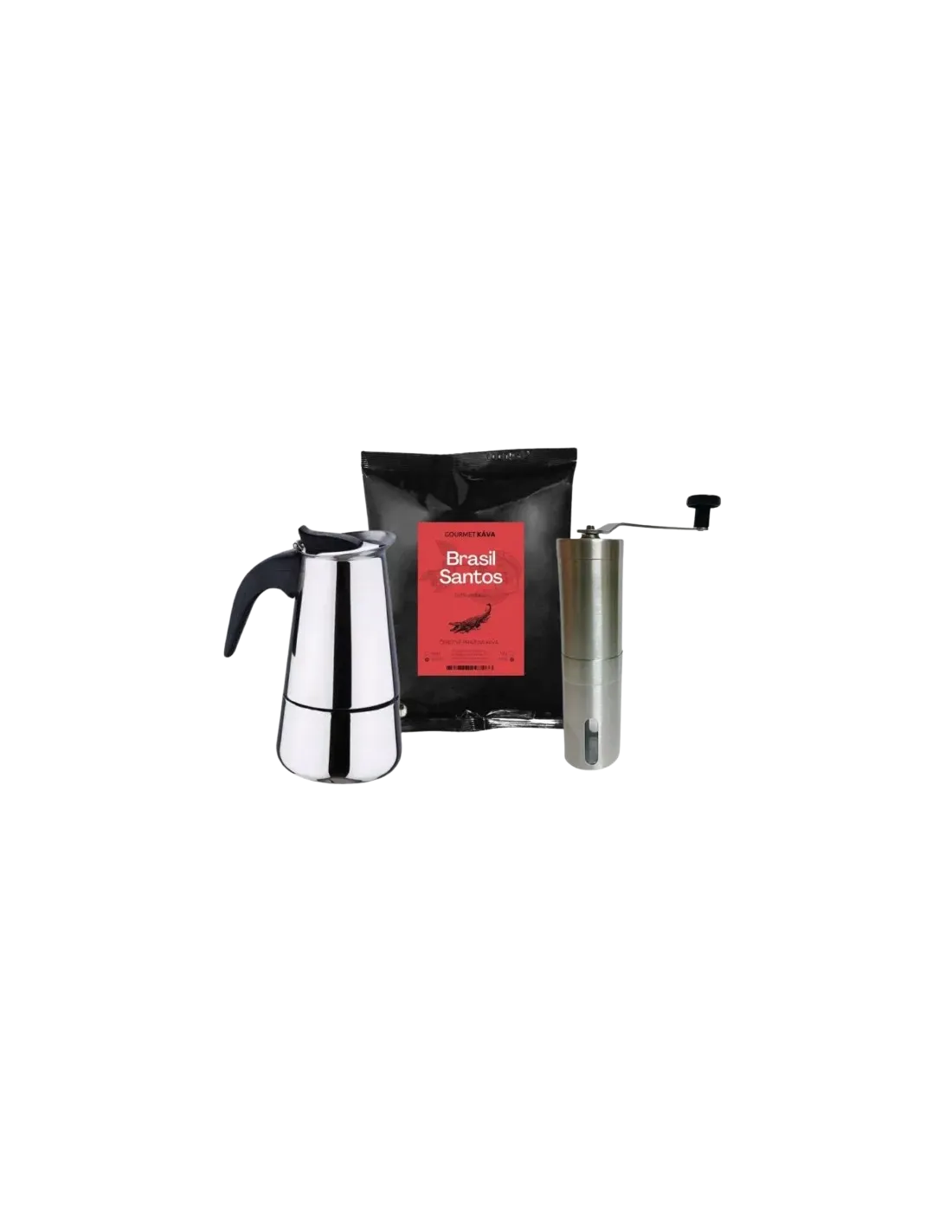 Sveža kava Brazilija Santos 250g, moka kafetiera Kaffia za 6 skodelic iz nerjavečega jekla in mlinček za kavo Kaffia Tall. Ta set vam bo pripravil močno kavo v italijanskem slogu, podobno espressu.
