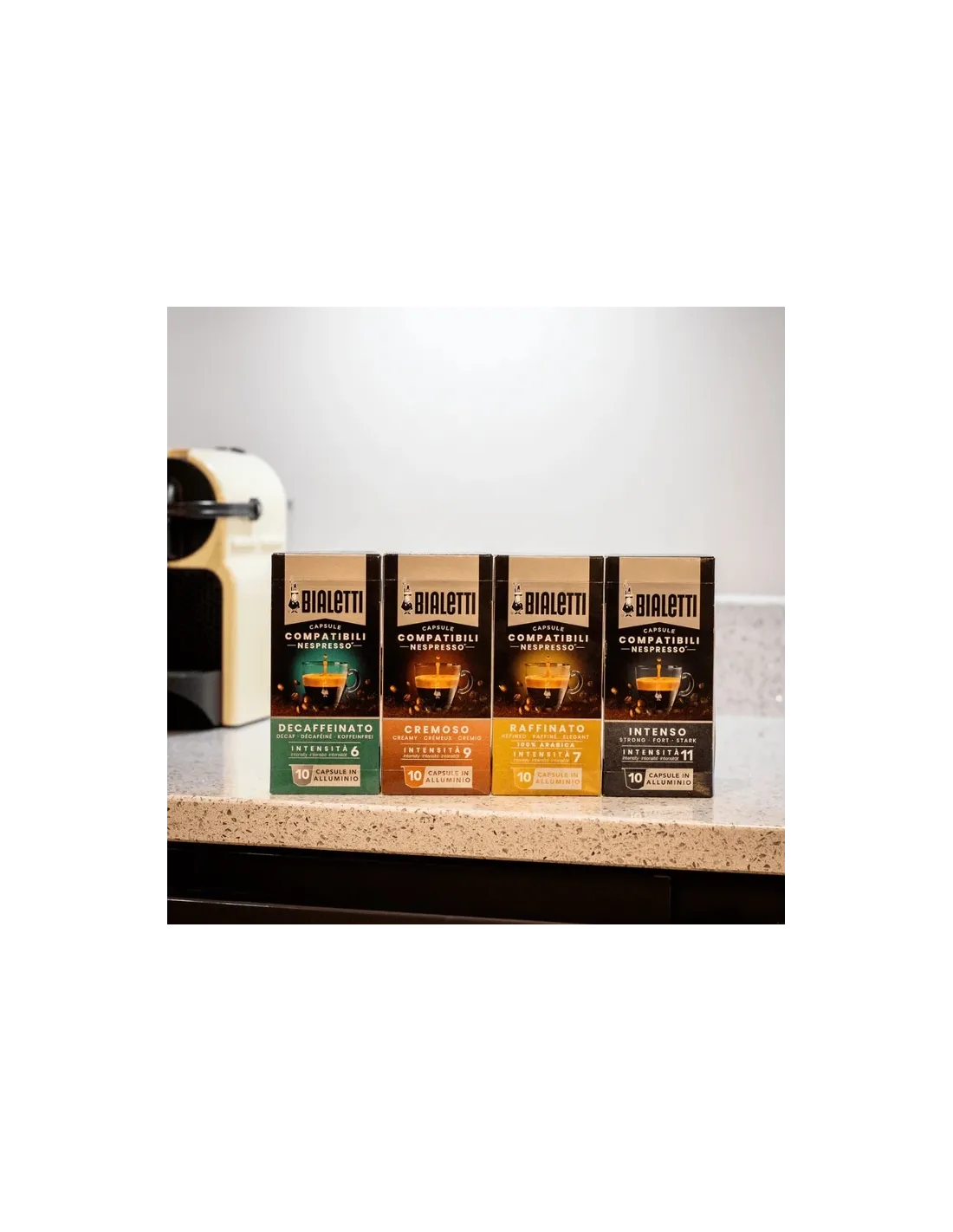 Bialetti Nespresso® kapsule Cremoso-italijanskakava brez kompromisov! Prinaša bogat okus pravega italijanskega espressa z zelo kremastim okusom. Zaradi temnega praženja kava ohrani svojo intenzivnost in polno aromo, zato lahko v popolni skodelici uživate kadar koli v dnevu.