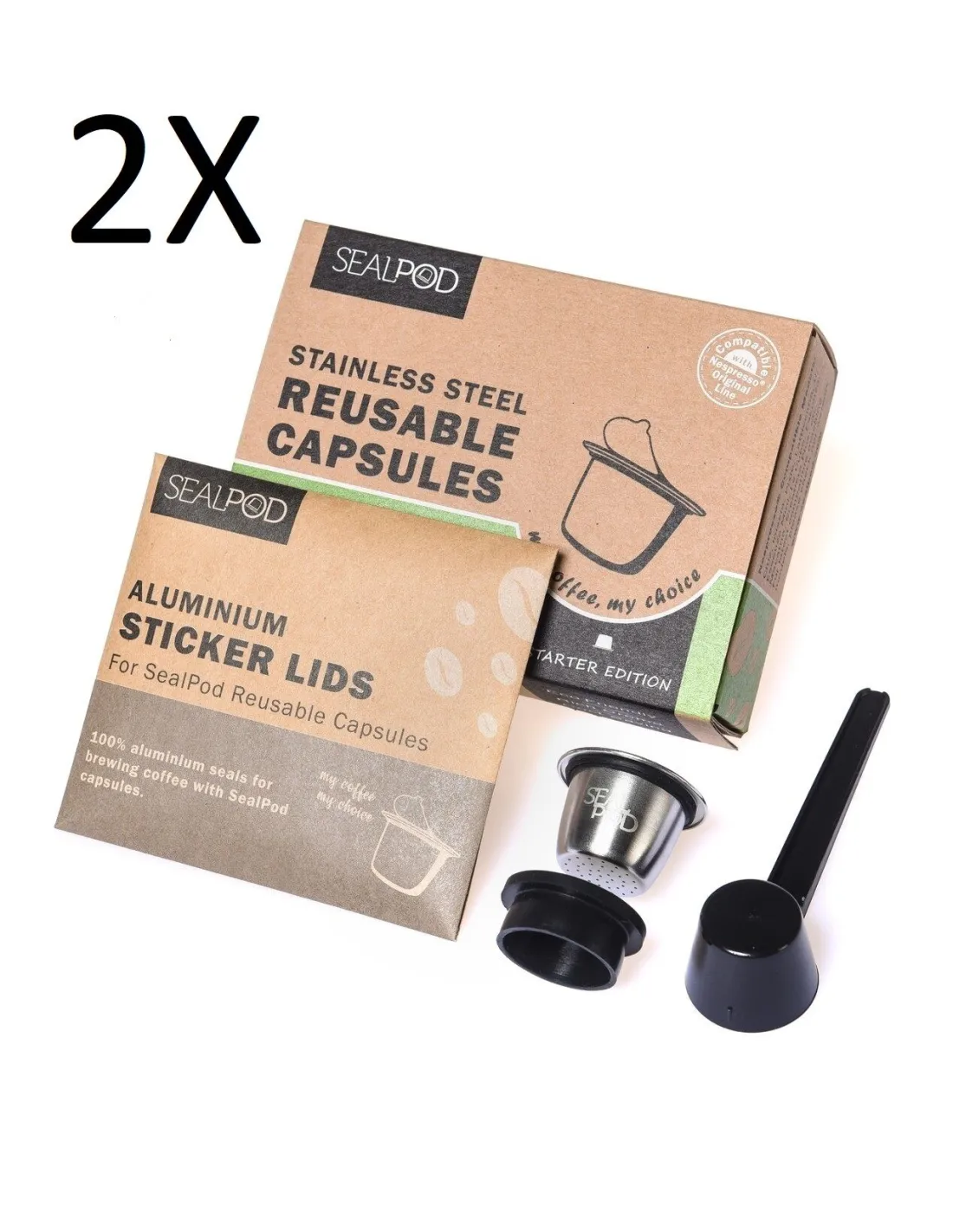 2x pakiranje po 1 k apsula za ponovno polnjenje Sealpod za kavne aparate Nespresso ®. Vključene so nalepke! Vedno imejte eno kapsulo na zalogi, ko je druga v "aparatu" ;-)