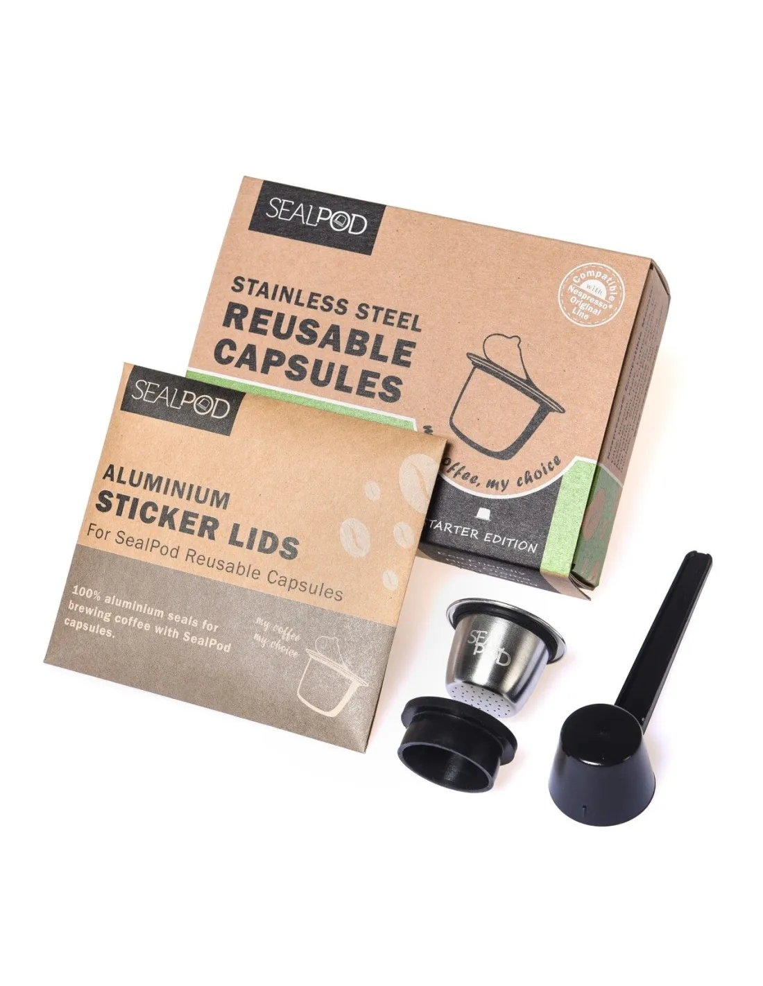 Kapsula Sealpod iznerjavečega jekla, ki jo je mogoče ponovno napolniti in je združljiva s kavnimi aparati Nespresso® ter omogoča pripravo sveže kave po vaši izbiri za delček cene. Vključene so nalepke!