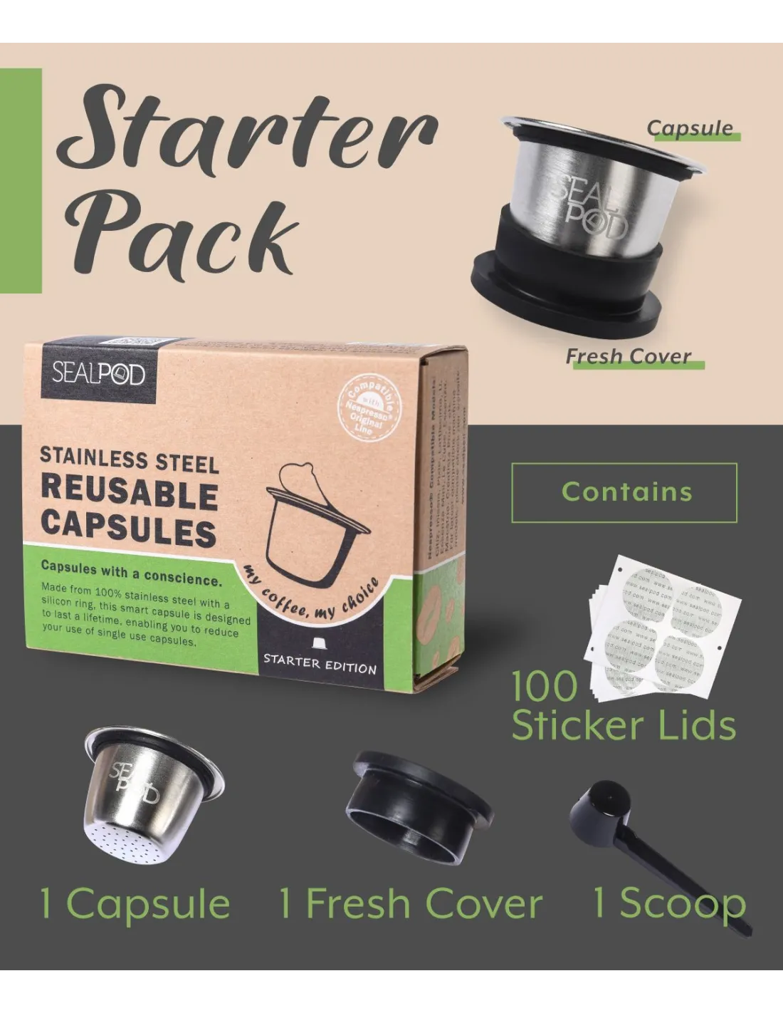 Vsako pakiranje vsebuje: 1x kapsula Sealpod iz nerjavečega jekla, 1x merilna skodelica, 1x črna kapica za ohranjanje svežine, 100x samolepilna kapica (lahko jo kupite >>tu<<)