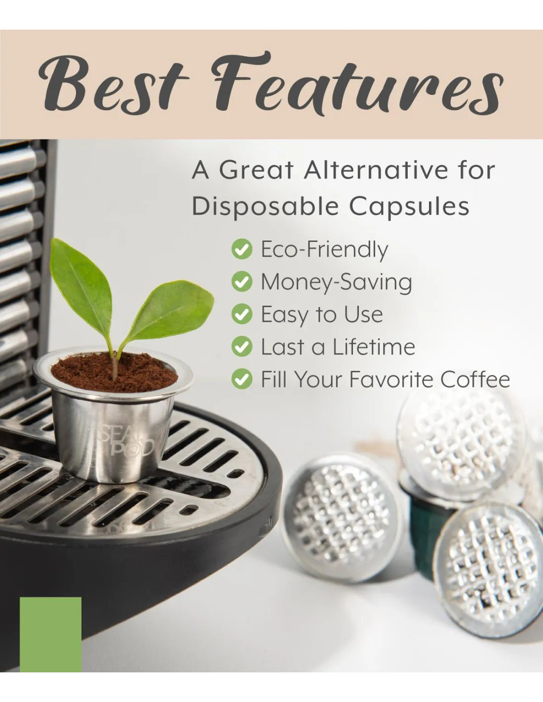Ekologija Kapsula Sealpod ni lebolj ekonomična, temveč tudi bolj zelena možnost za pripravo sveže kave. Uporabljene kapsule vam ne bo več treba vsakič vreči v smeti, kar bo pozitivno vplivalo na okolje.