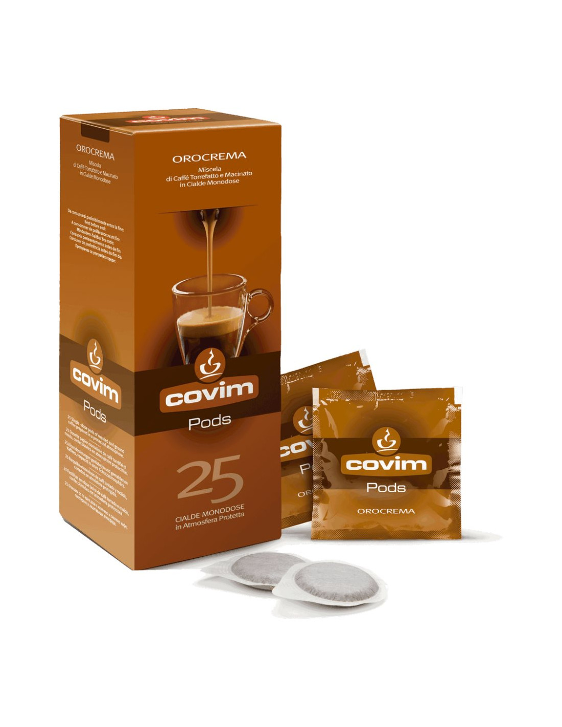 E.S.E. podi Covim Orocrema, 25 obrokov - mešanica arabike in robuste za bogato kremo in uravnotežene čokoladne note.