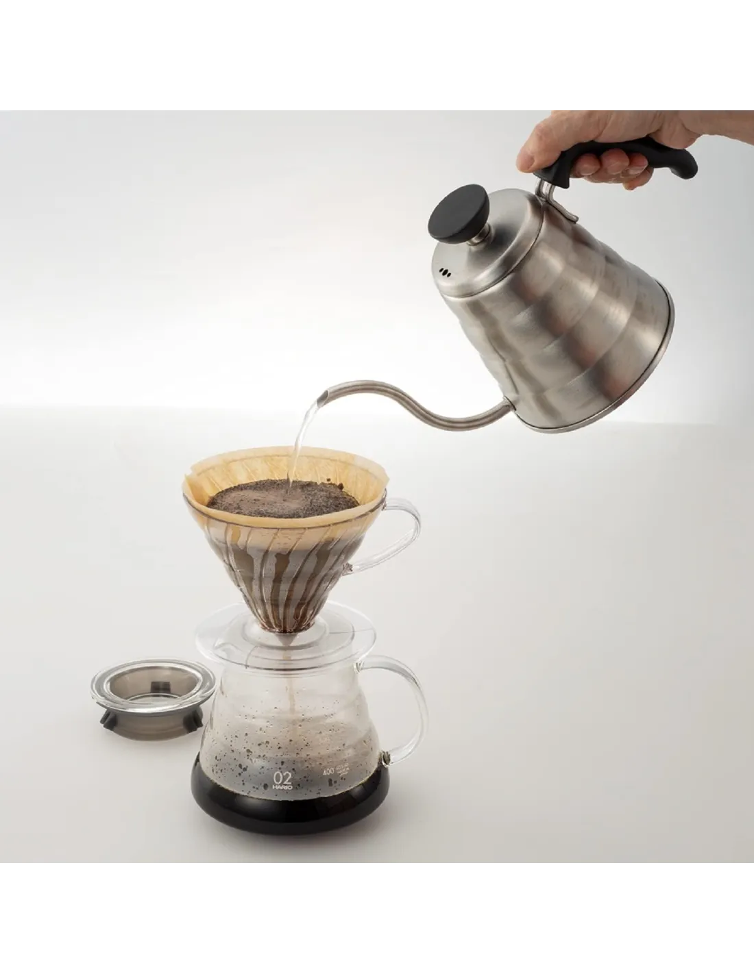 Pri Hario Buono kotličku to ne more biti težava. Zaradi posebej oblikovane dolge izlivne cevi je tok vode počasen in enakomeren. Pravilen način nalivanja je prav tako pomemben pri pripravi kave s French pressom ali Aeropressom.