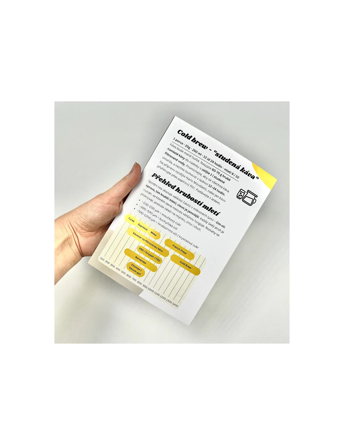 Nikoli več ne boste v zadregi, kako pripraviti kavo. Ta priročni vodnik na enem mestu povzema vse pomembno: priporočene odmerke, razmerja med kavo in vodo, temperature, čas kuhanja in nastavitve mlinčka - točno tako, kot to potrebujete pri pripravi doma ali na poti. Zasnovan je za hiter pregled - kot nalašč za kuhinjo, za zalogo kave ali kot vložek v darilni škatli.