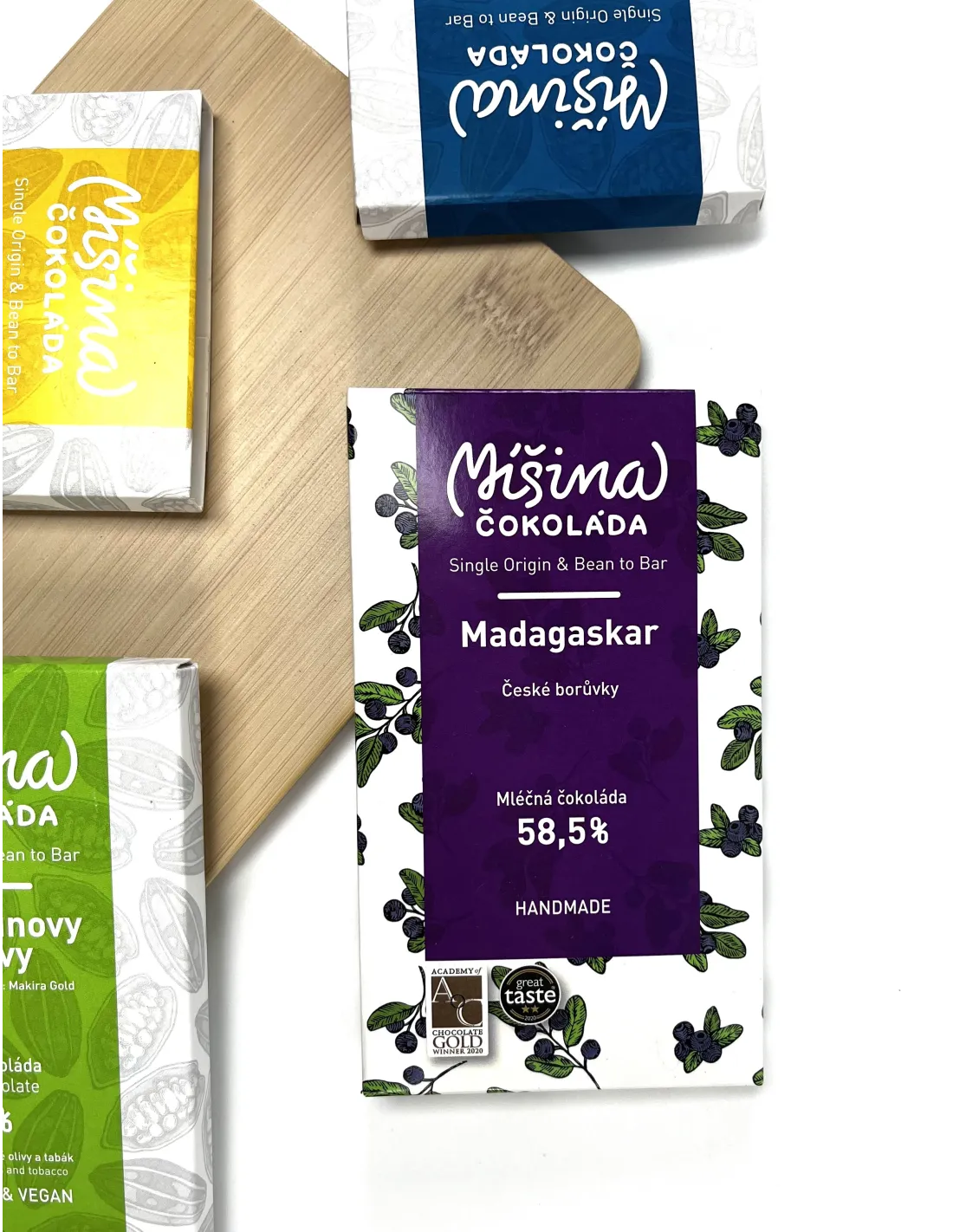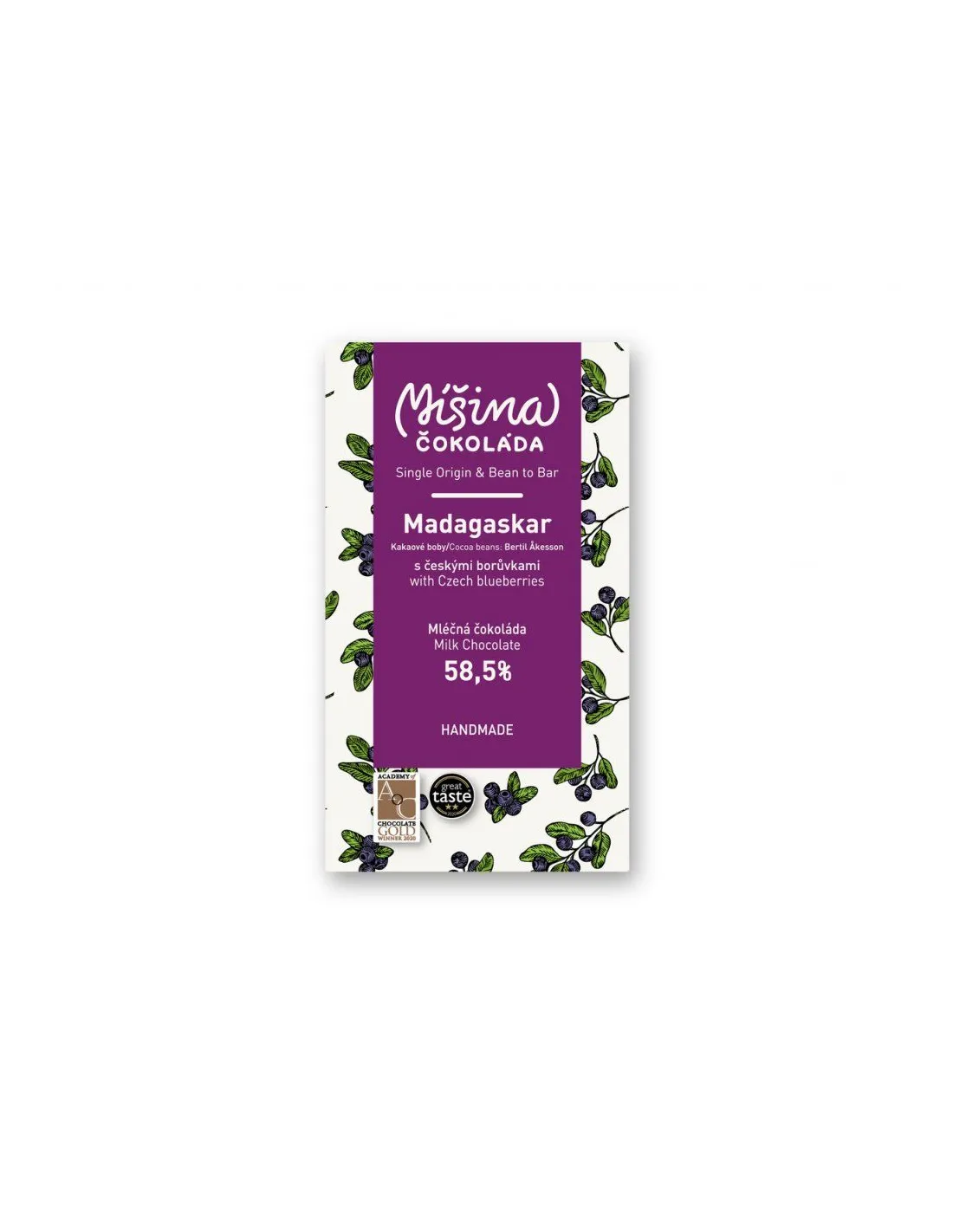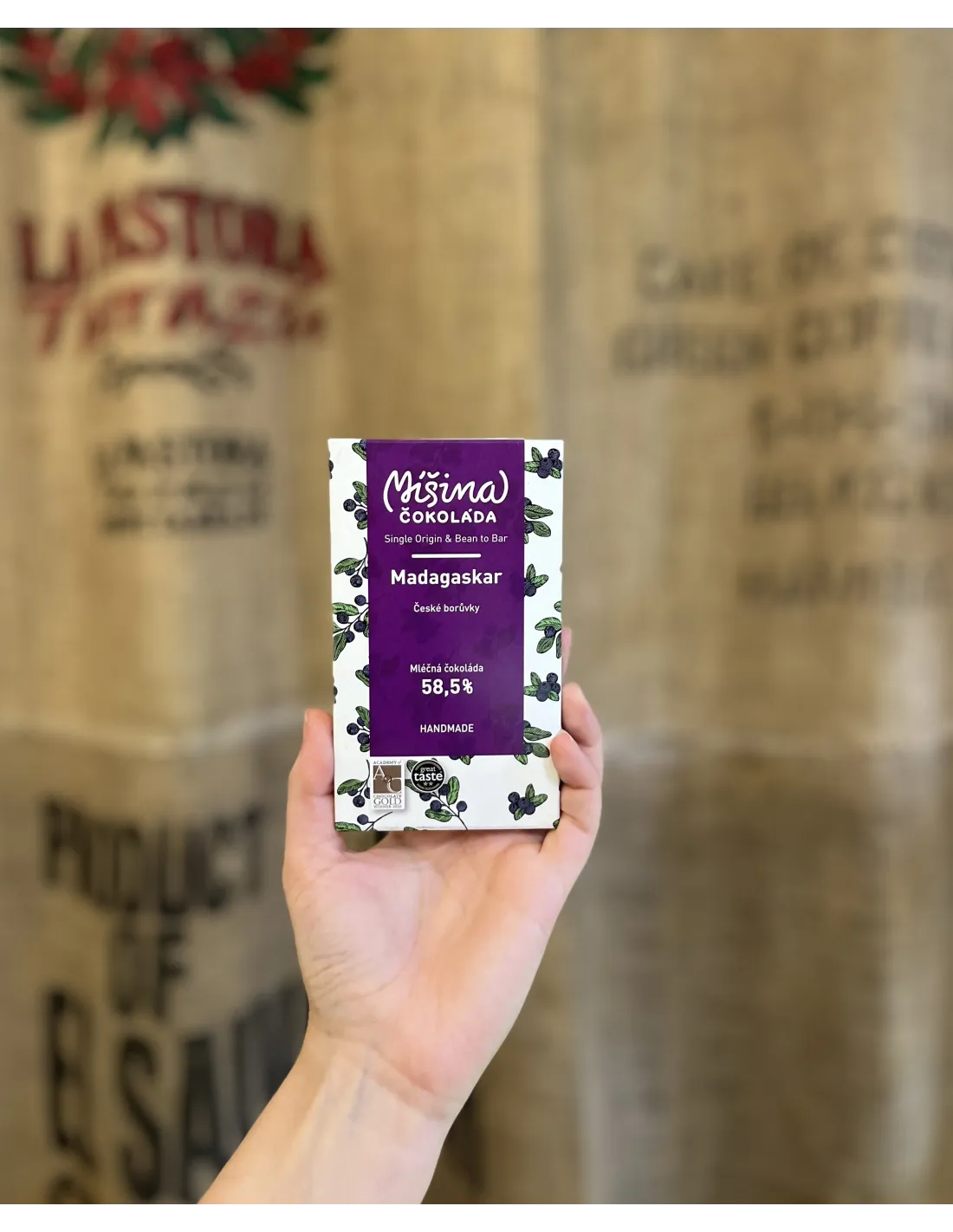 Mlečna čokolada iz ekoloških kakavovih zrn z Madagaskarja. Ta zrna imajo okus po sadju, dodali pa so jim tudi borovnice iz čeških gozdov.