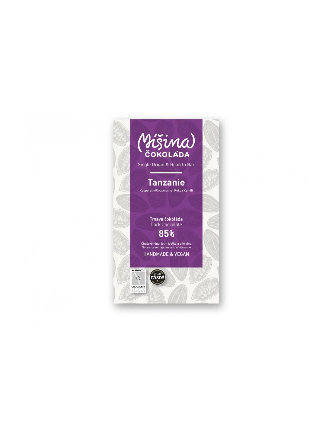 Temna čokolada 85% z visoko vsebnostjo izbranih ekoloških kakavovih zrn iz Tanzanije. Gladka do maslena s pridihom jabolk in češenj.