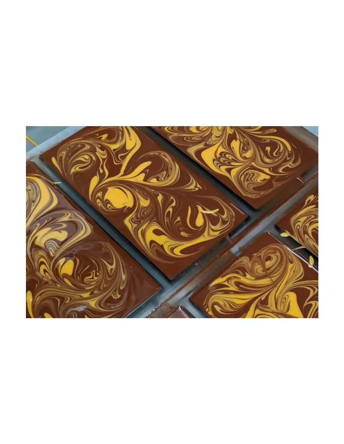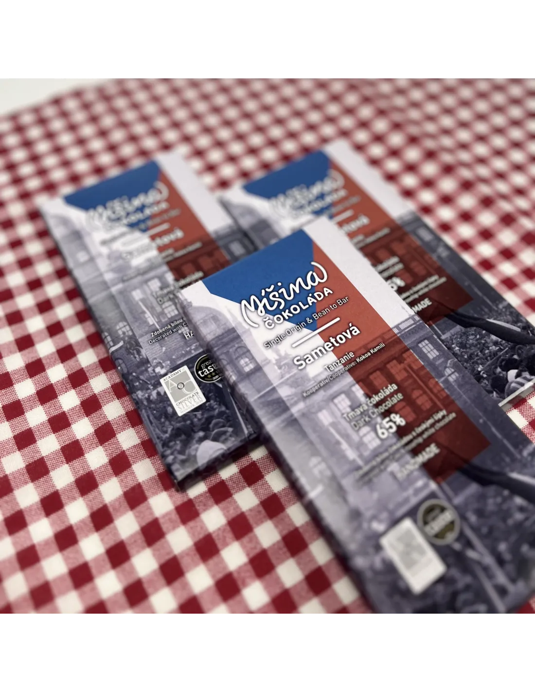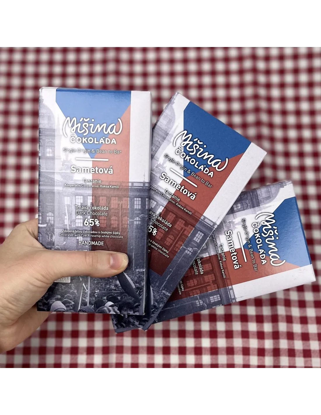 Temna čokolada 65 % iz ekoloških kakavovih zrn iz Tanzanije je ročno okrašena z belo čokolado s češkimi šipki. Uporabno najmanj do datuma 9.10.2025