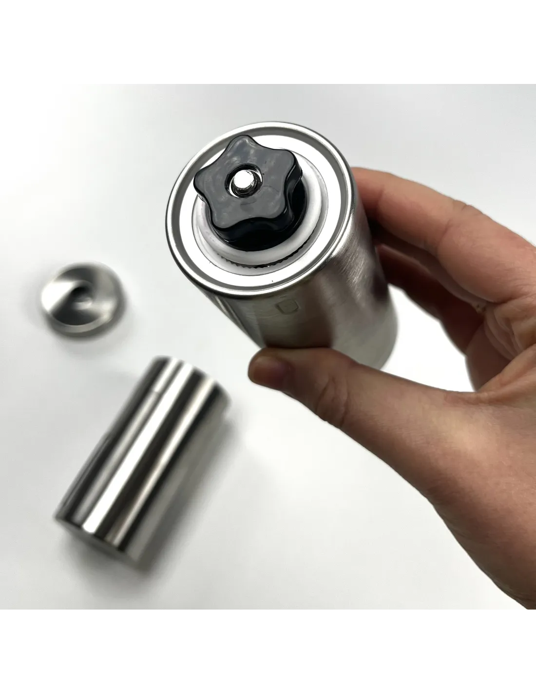 Eleganten ročni mlinček Kaffia Tall iznerjavečega jekla s keramičnimi brusnimi kamni za hitro in udobno mletje tudi na poti.