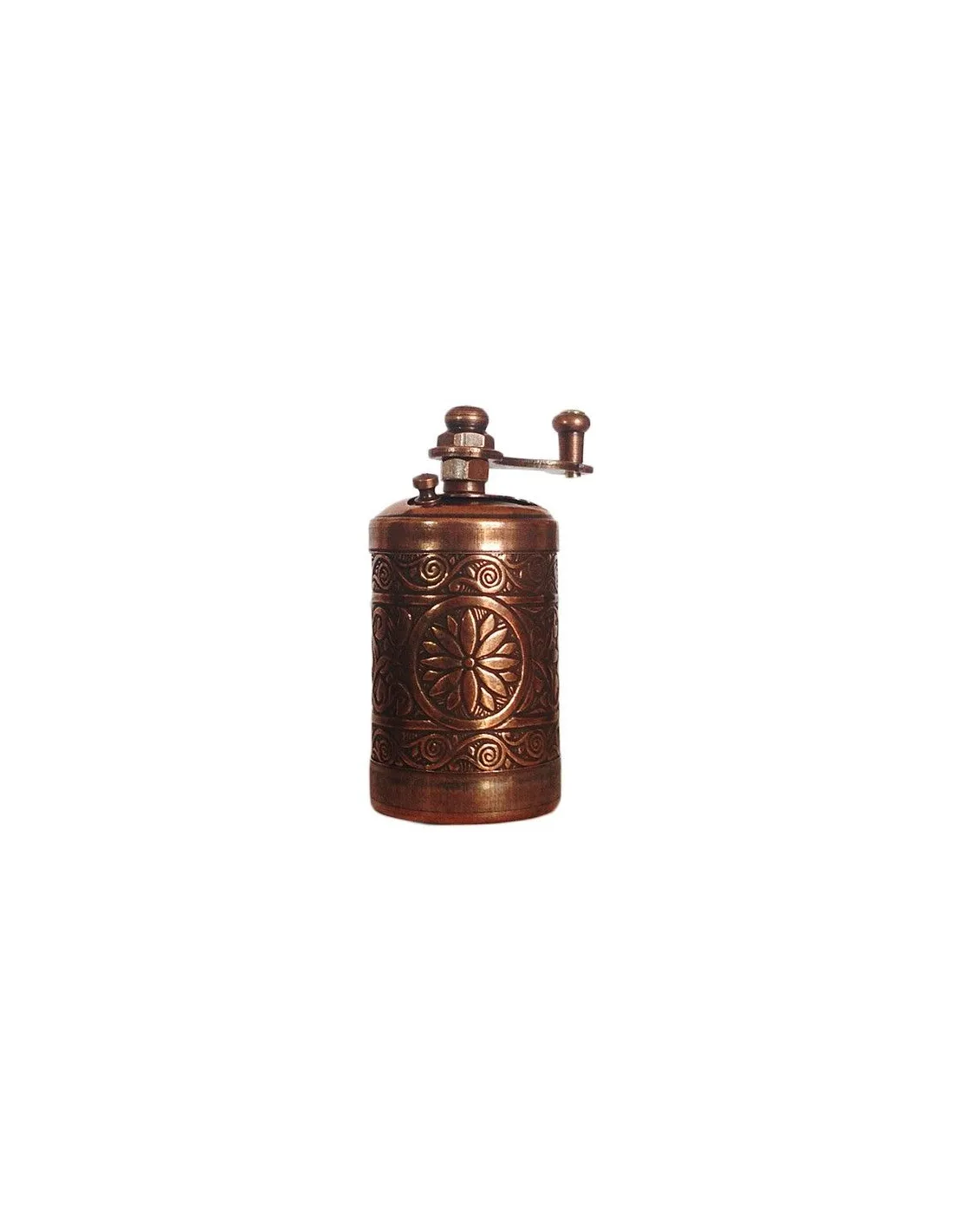 Ročni mlinček za poper in druge začimbe iz serije Istanbul v čudovitem tradicionalnem turškem slogu. Mlinček je izdelan iz medenine bakrene barve, orodje za mletje je kovinsko. Na vrhu mlinčka so odprta vrata za vlivanje začimb, na dnu mlinčka pa je pokrov, ki ga je mogoče po uporabi namestiti. Certifikat ISO 9001 kaže na kakovostno izdelavo tradicionalnega turškega proizvajalca. Z našim turškim mlinčkom za kavo enake oblike lahko ustvarite čudovito kombinacijo.