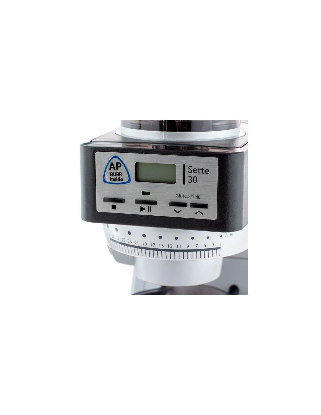 Na sprednji strani mlinčka boste našli preprosto nadzorno ploščo z osvetljenim zaslonom z led osvetlitvijo. Uporabnik lahko nastavi čas mletja znatančnostjo 0,01 sekunde. S pritiskom na gumb boste tako vedno dobili natančno serijo. (Za primerjavo - mlinčka Sette 270 in Sette 270W imata 3 nastavljive gumbe, na katerih lahko programirate 3 različne vrednosti, mlinček Sette 270 deluje po načelu prilagajanja časa mletja, mlinček Sette 270W pa omogoča prilagajanje teže mlete kave).