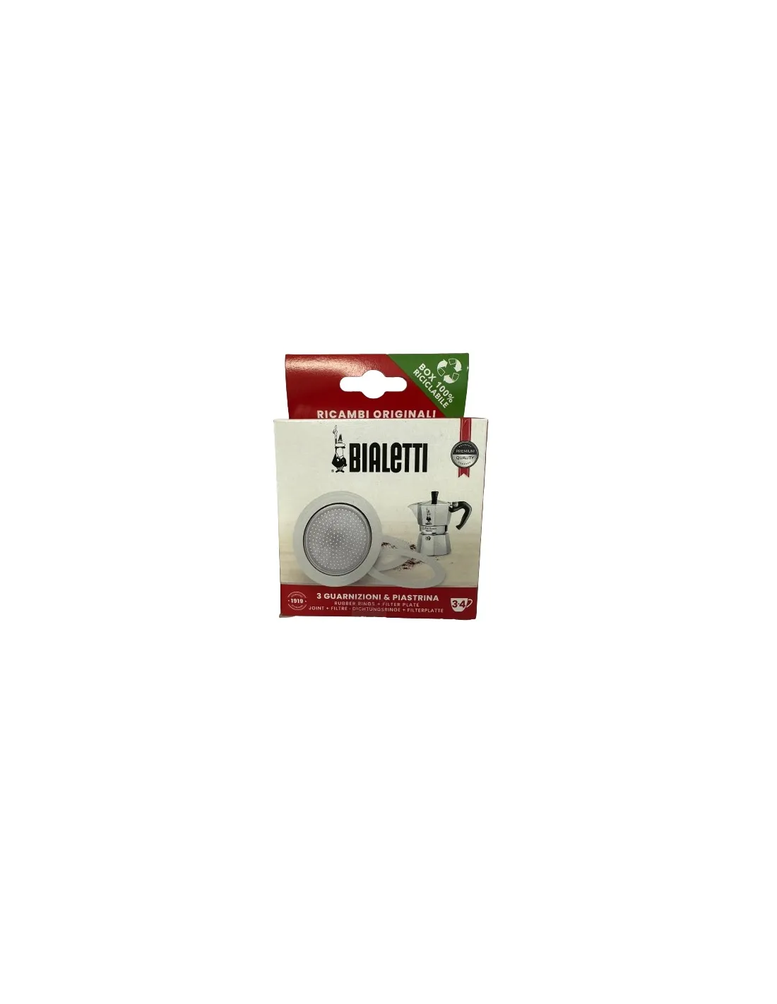 Paket vsebuje 3x nadomestna gumijasta tesnila za aluminijaste moka lončke Bialetti v velikosti 3 ali 4 skodelic in 1x nadomestno aluminijasto cedilo.