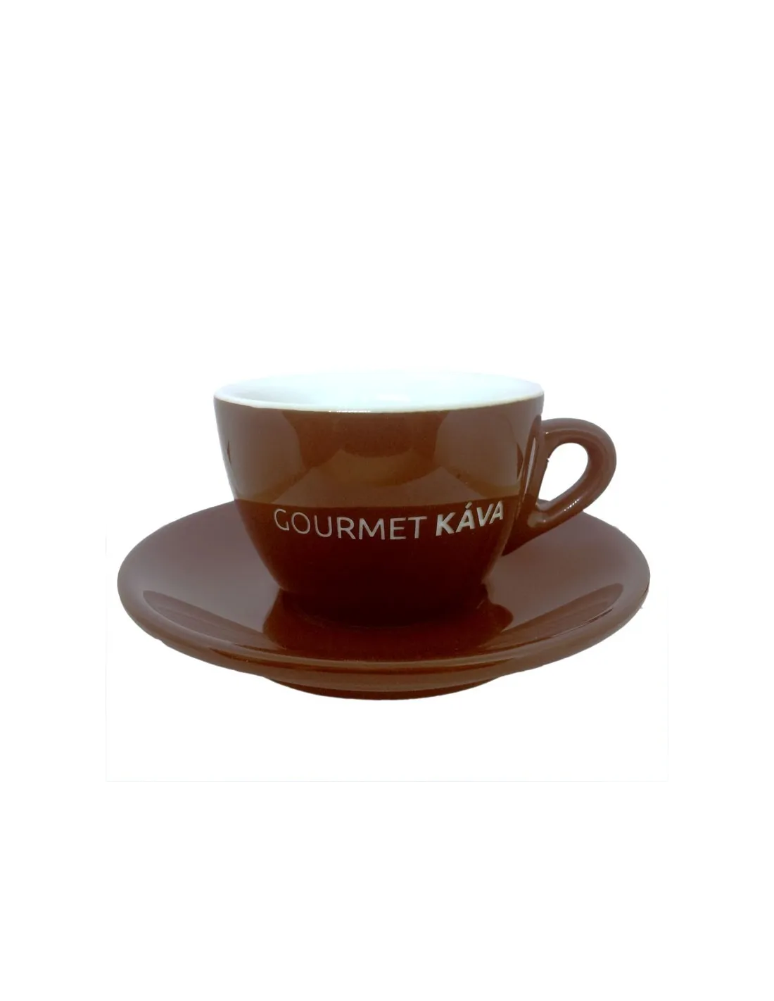 Porcelanska skodelica za kapučino s prostornina 145ml. Vključujepodstavek. Barva: rjava z belim logotipom.