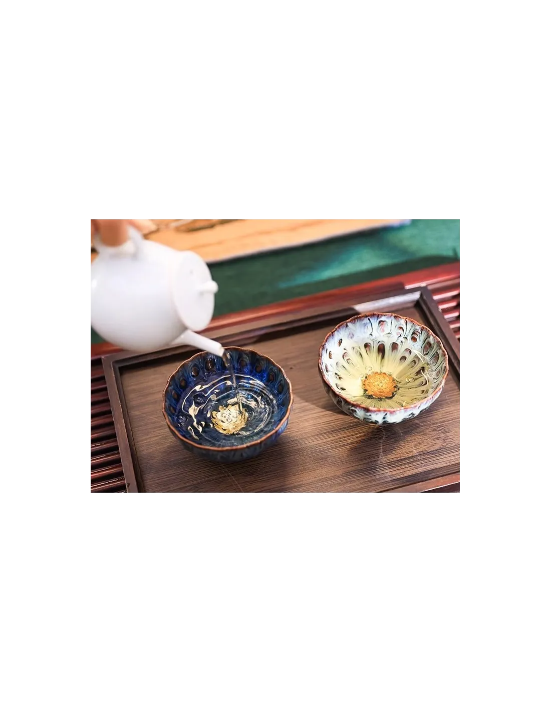 Eleganten set skodelic Kaffia Blossom z ročno izdelanim dizajnom, ki ga navdihujejo cvetlični motivi. Na dnu vsake skodelice je nežen motiv lotosa , ki najbolj izstopa pri točenju svetlega ali čistega čaja.