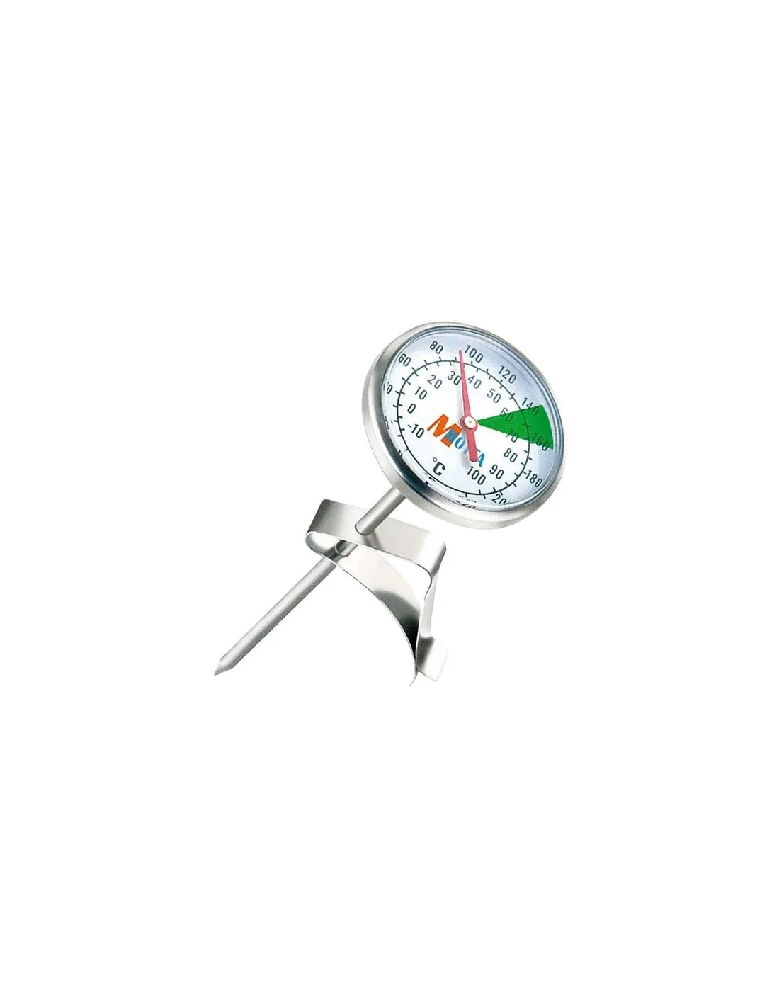 Profesionalni analogni termometer za mleko italijanskega metalurškega podjetja Motta je nepogrešljivo orodje za vse bariste. Zaradi praktične zaponke se zelo dobro drži na vašem latte.