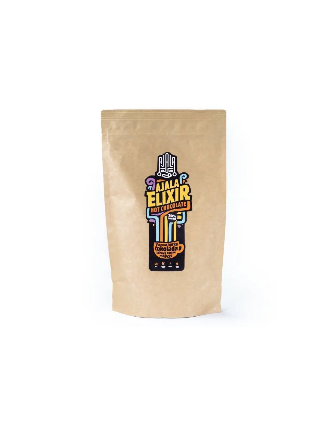 Ajala Elixir vsebuje čisto 70 % čokolado Ajala, ki je narejena iz izbranih, etično kupljenih kakavovih zrn ekološke kakovosti in trsnega soka. Rezultat je izjemno bogat in zadovoljiv okus .