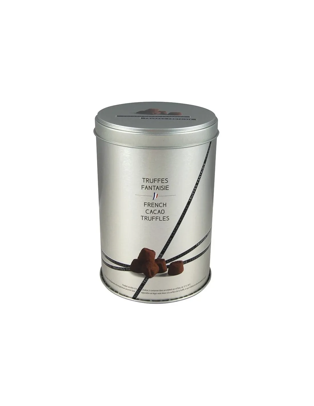 Nežni kakavovi tartufi Mathez Fantaisie s slano karamelo v elegantni srebro pločevini. Odlični ob kavi ali za zabavo.