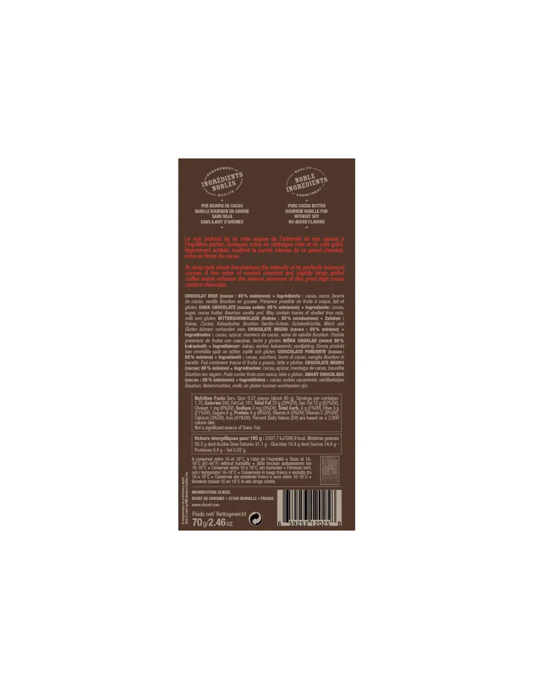 85-odstotna čokolada iz skrbno izbrane kombinacije različnih sort kakava iz Srednje Amerike, Afrike in Jave. Intenzivna, a nežna čokolada, prijetno uravnoteženega okusa.