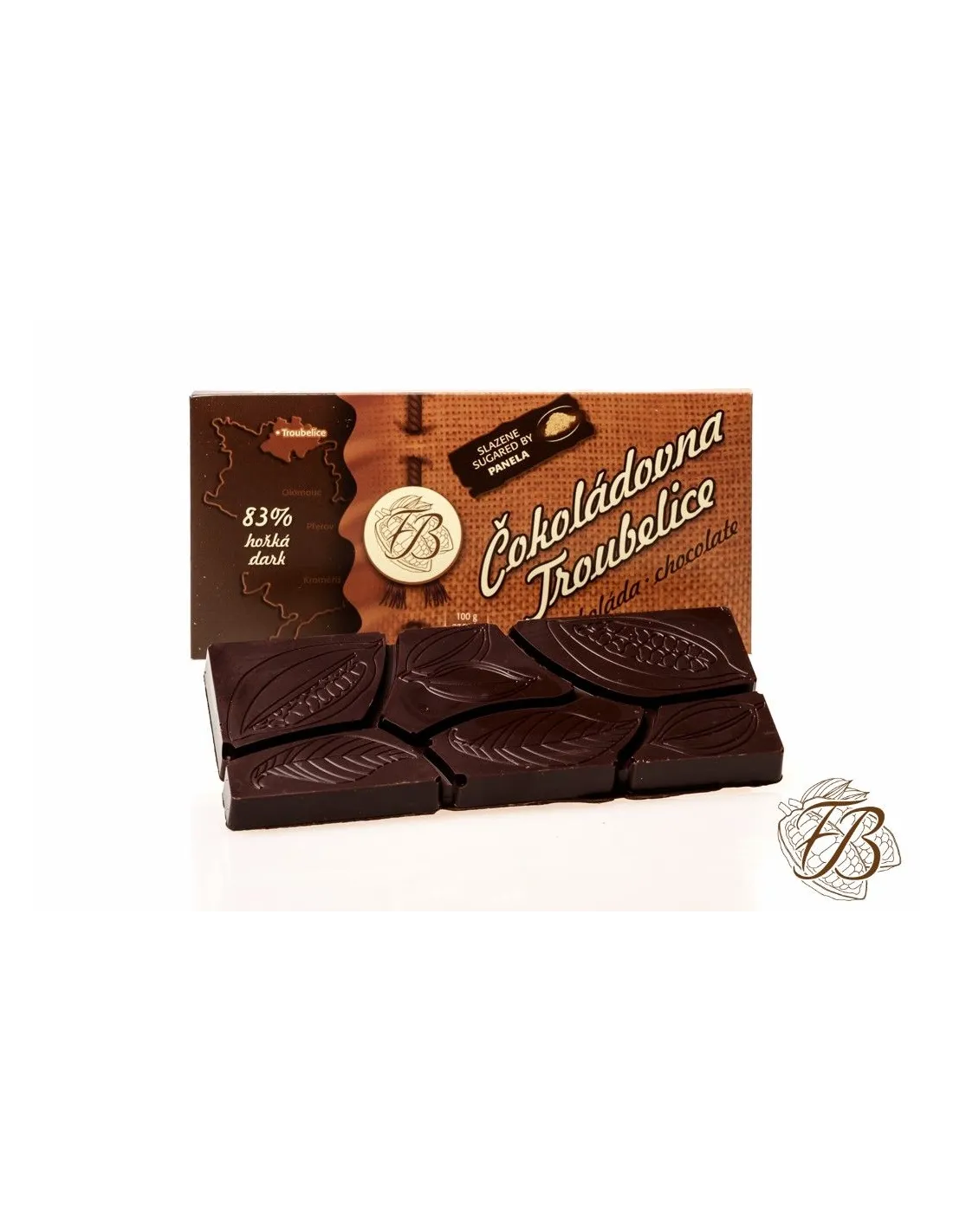 Temna 83-odstotna čokolada, temna čokolada s kislimi podtoni kakavovih zrn, sladkana s trsnim sokom .
