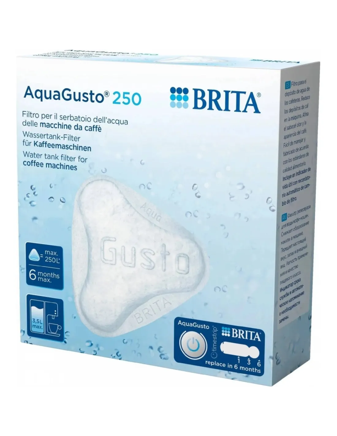 Redna uporaba filtra Brita AquaGusto 250 prispeva k boljši kakovosti pijače, zmanjšuje nabiranje vodnega kamna in zmanjšuje potrebo po pogostem odstranjevanju vodnega kamna v aparatu. Združljiv je z večino komercialno dostopnih domačih aparatov za kavo s posodo za vodo.