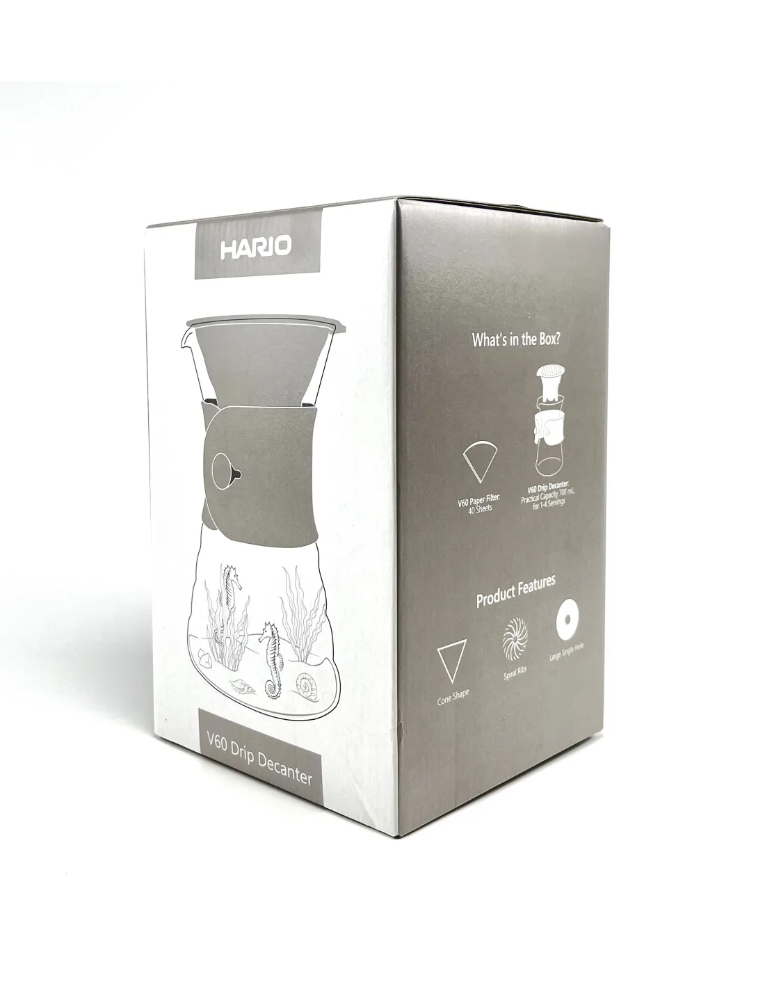 Če se resno ukvarjate s filtrirano kavo ali pa vam je kava preprosto všeč, vam bo všeč Hario V60 Drip Decanter, ki je sestavljen iz plastičnega kapljalnika V60, elegantne posode iz borosilikatnega stekla in 40 kosov papirnatih filtrov Hario, velikosti. 02. Vse to je v dizajnu serije V60.