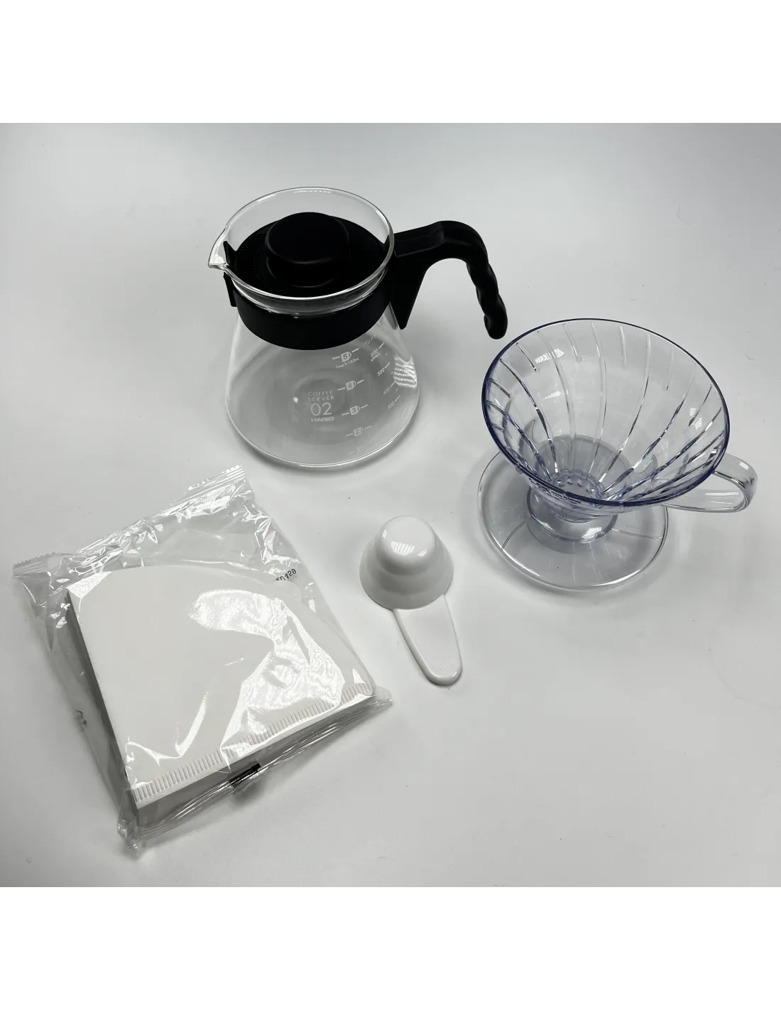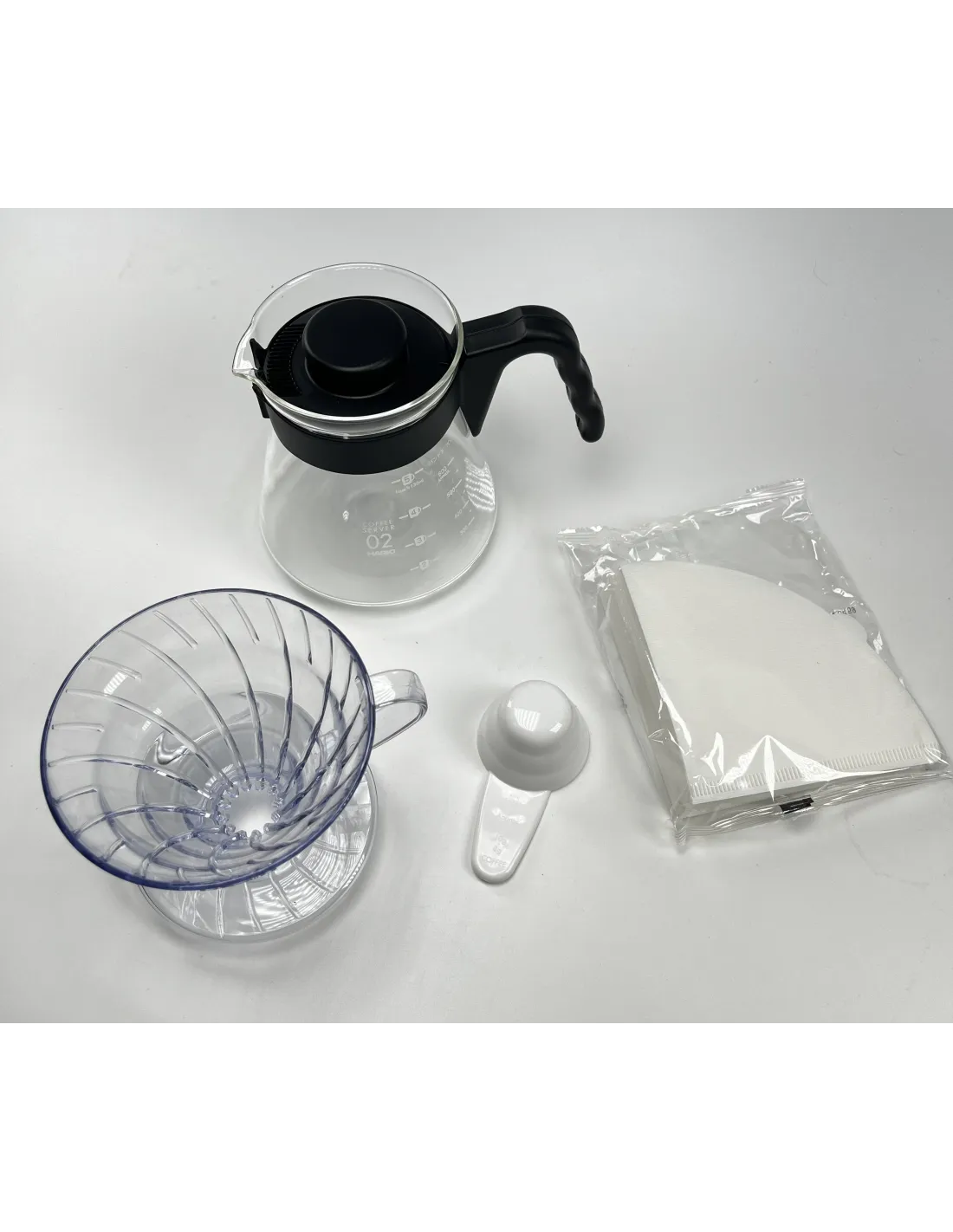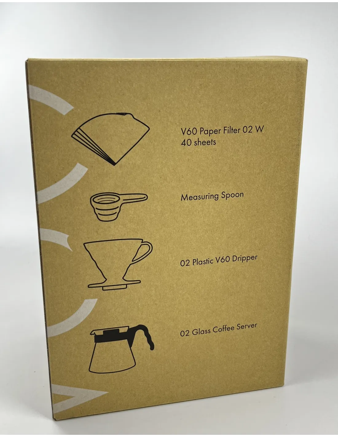 Komplet vključuje plastični dripper Hario V60-02 za pripravo 1–4 skodelic, stekleni vrč Hario s plastičnim ročajem in pokrovom prostornine 600 ml, 40 kosov belih papirnatih filtrov in plastično merico za kavo. Skratka, vse lepo zbrano v vrhunski Hario kakovosti.