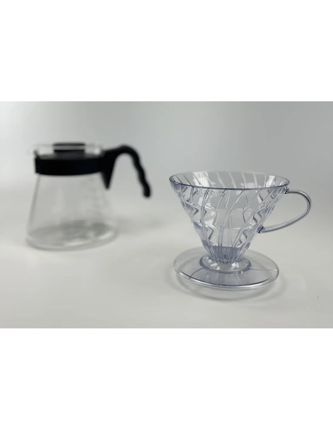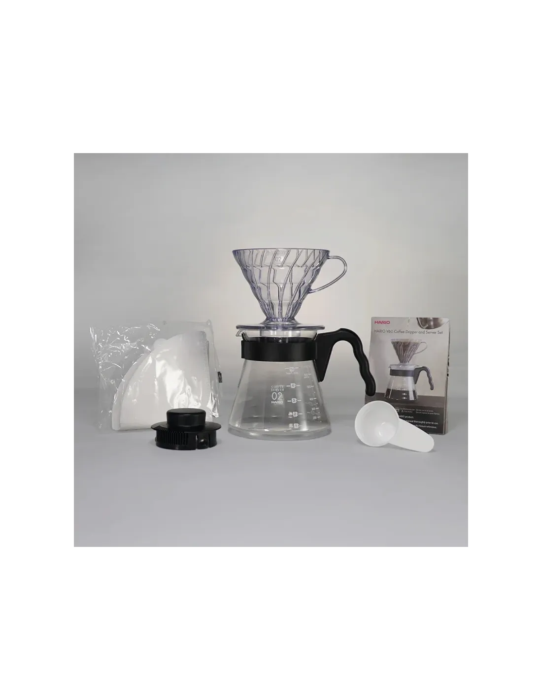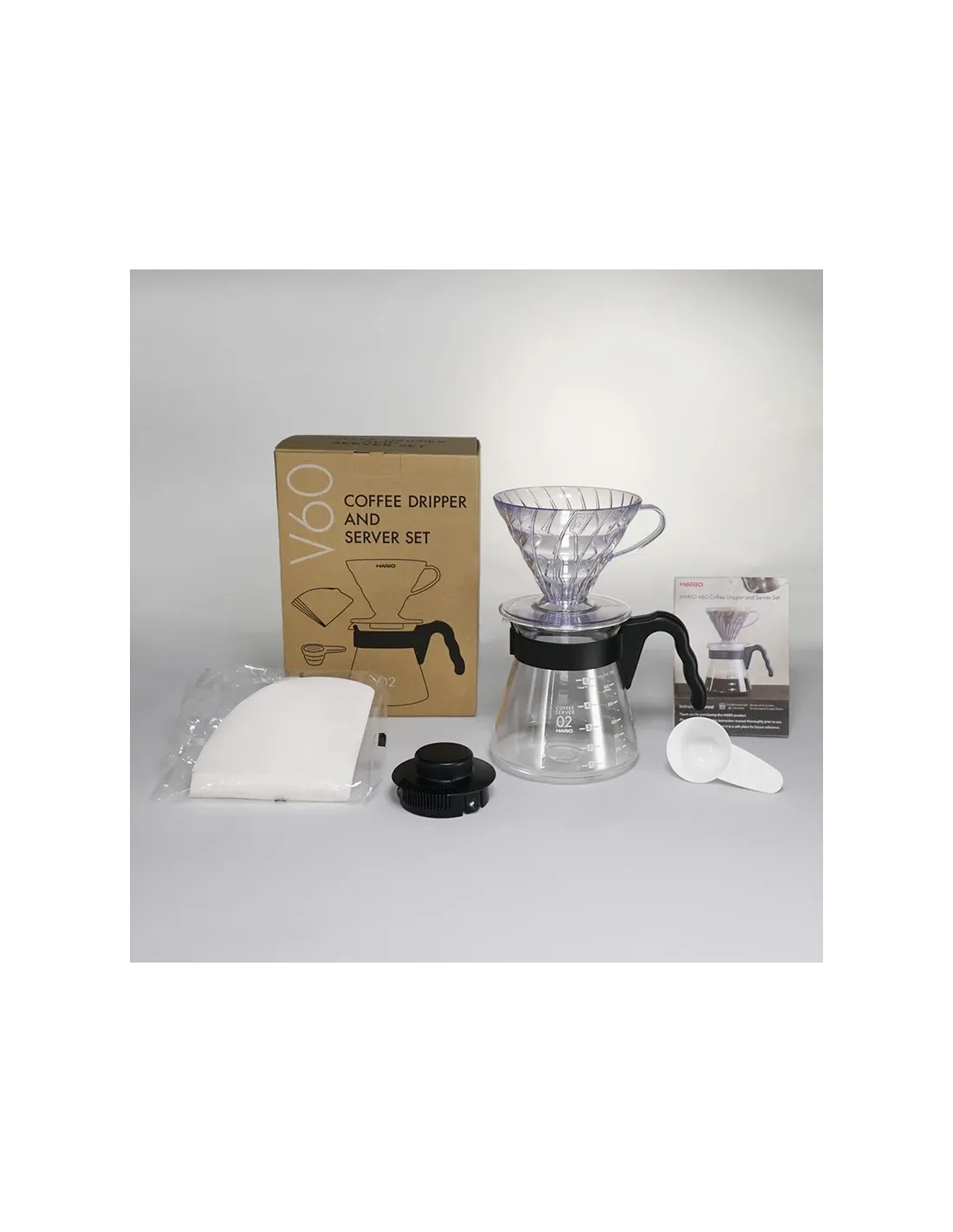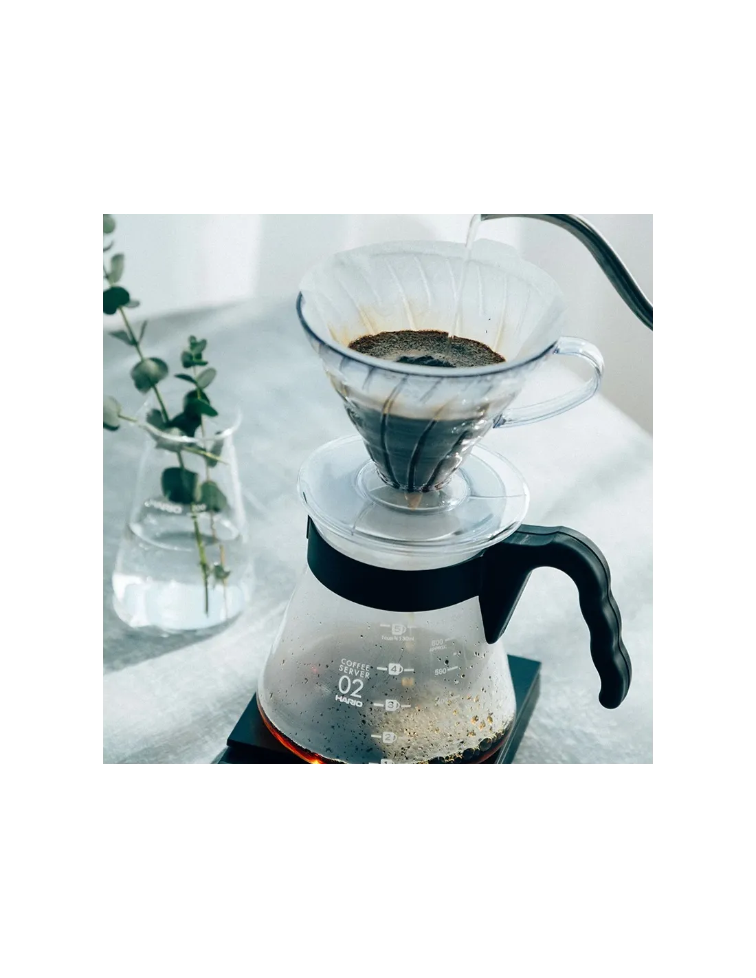 Komplet vključuje plastični dripper Hario V60-02 za pripravo 1–4 skodelic, stekleni vrč Hario s plastičnim ročajem in pokrovom prostornine 600 ml, 40 kosov belih papirnatih filtrov in plastično merico za kavo. Skratka, vse lepo zbrano v vrhunski Hario kakovosti.
